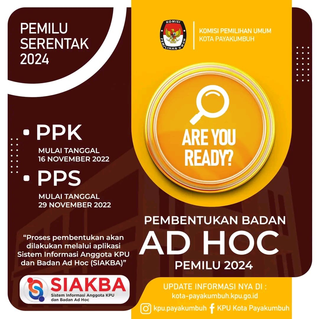 Hallo #TemanPemilih, yuk persiapkan dirimu untuk Pembentukan Badan Ad Hoc Pemilu 2024. Pembentukan Panitia Pemilihan Kecamatan (PPK) mulai tanggal 16 November 2022 dan Pembentukan Panitia Pemungutan Suara (PPS) mulai tanggal 29 November 2022. Proses pembentukan PPK dan PPS akan dilakukan melalui aplikasi Sistem Informasi Anggota KPU dan Badan Ad Hoc (SIAKBA).