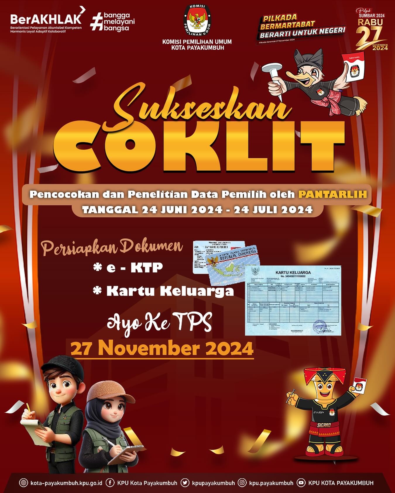 #TemanPemilih, yuk bersama-sama sukseskan tahapan pencocokan dan penelitian data pemilih. Pantarlih akan datang ke rumah #TemanPemilih untuk memastikan terdaftar sebagai pemilih pada Pemilihan Serentak Nasional Tahun 2024 di Kota Payakumbuh.